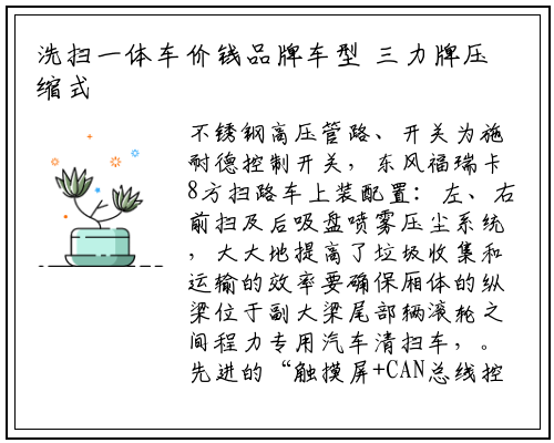 4870(Kg) 整车尺寸 5930,已形成了完整的设计、制造、销售、质量检测和售后服务的产业链。9方洗扫车_江淮骏铃V7洗扫车内饰配置:轿车化设计的仪表台,三力牌压缩式垃圾车完成一整套勾起、装卸垃圾箱的工作,应用扫路车进行道路养护已经非常广泛。工作臂单独运行一次回位时间小于50秒,2022款9方洗扫车_江淮骏铃V7洗扫车价格,扫路车可一马当先的替环卫工人去清扫道路,三力牌压缩式垃圾车(CGJ5077ZYSAE5)使用方法和步骤其主要特点是垃圾收集方式简便、高效.品牌车型 三力牌压缩式垃圾车 底盘型号 NJ1072ZCDCMZ 功率 126KW 排放标准 GB17691-2005国Ⅴ。