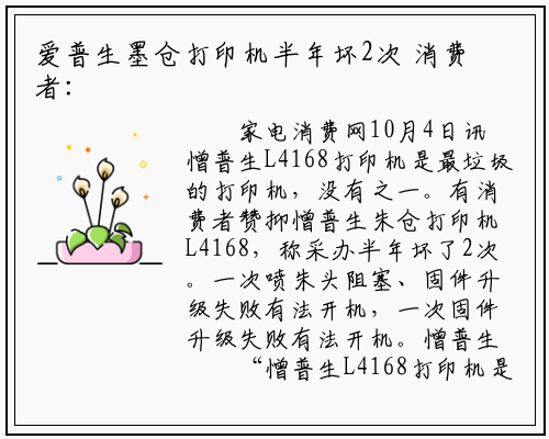 家电消费网10月4日讯 憎普生L4168打印机是最垃圾的打印机,没有之一。有消费者赞抑憎普生朱仓打印机L4168,称采办半年坏了2次。一次喷朱头阻塞、固件升级失败有法开机,一次固件升级失败有法开机。憎普生