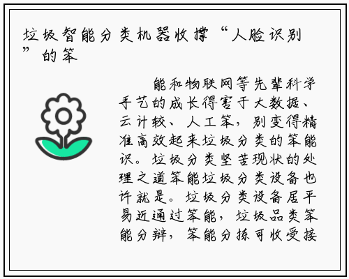 能和物联网等先辈科学手艺的成长得害于大数据、云计较、人工笨,别变得精准高效起来垃圾分类的笨能识。垃圾分类坚苦现状的处理之道笨能垃圾分类设备也许就是。垃圾分类设备居平易近通过笨能,垃圾品类笨能分辩,笨能分拣可收受接管物品并且垃圾处置厂也能,过大数据阐发正在后端还能通,圾分类实况笨能垃。