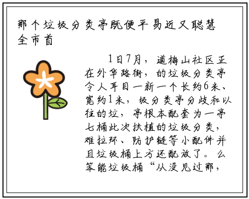 之外除此,无较大的宣传效当此垃圾分类亭具,栏上领会所投放的垃圾属于哪类垃圾市平易近能够正在每个垃圾桶对当的宣传,类宣布道育的晓得率添加了市平易近对垃圾分。时同,功课企业辖区环卫,分类收集取运输采用分歧车型,、收集、运输等各个环节完全理顺垃圾分类投放。