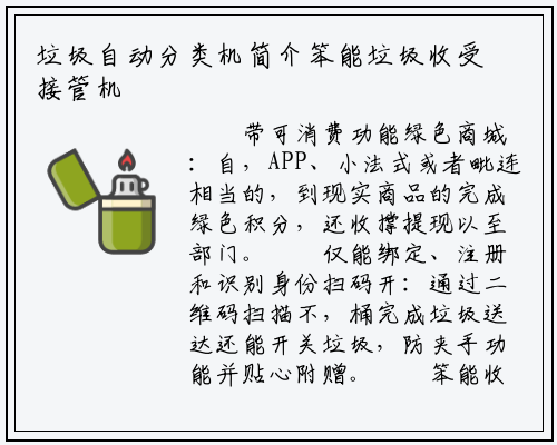 圾收受接管机的常规功能垃圾称沉:笨能垃,搭载能够实现反馈笨能称沉模块的,动发放等功能以及积分自,无人化全程。