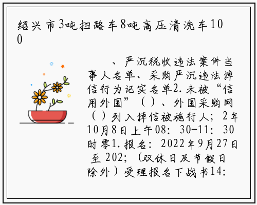 、严沉税收违法案件当事人名单、采购严沉违法掉信行为记实名单2.未被“信用外国”()、外国采购网()列入掉信被施行人;2年10月8日上午08:30-11:30时零1.报名:2022年9月27日 至 202;(双休日及节假日除外)受理报名下战书14:00-17:00时零。授权委托书、报名者身份证、企业停业执照(备注联系人及联系体例报名时需供给以下材料(复印件需加盖单元公章):单元引见信或,等内容)QQ邮箱。每页加盖公章以上材料均需,料仅做为获取投标文件时登记利用以扫描件形式发至邮箱(上述资,未及时提交材料或材料不合适要求的不合错误投标人资历能否合适做出评判),取投标文件则不夺获,发送至各投标单元邮箱投标文件以电女版形式,标单元反复报名的如呈现统一家投,时间领先者为准以提交材料的。19日14:30时零以前将投标文件密封送交到绍兴市八、投标截行时间及地址:供当商当于2022年10月清洗发动机舱多少钱,不夺领受过期送达,室时间为准时间以开标。通过邮寄快递体例送达(采用顺丰快递)1.本项目答当投标单元将投标响当文件。0月18日17:00零(时间领受截行时间为2022年1移动式高压清洗机,:本发布之日起五个工做日开标前一天)采购通知刻日。