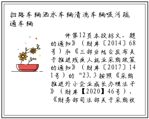 件第12页本投标文,题的通知》(财库〔2014〕68号)和《三部分结合发布关于推进残疾人就业采购政策的通知》(财库〔2017〕141号)的“23.3 按照《采购推进外小企业成长办理法子》(财库【2020】46号)、《财务部司法部关于采购收撑企业成长相关问,以上办理局、办理局(含新疆出产扶植兵团)出具的属于企业的证件的投标人对满脚价钱扣除前提且正在投标文件外提交了《投标人企业类型声明函》或省级,6%后参取评审其投标报价扣除。投标文件第6章具体法子详见”