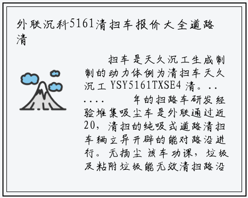 清扫车报价大全频道外联沉科5161,全、外联沉科5161清扫车型号报价等浩繁外联沉科5161清扫车相关产物报价消息汇集了外联沉科5161清扫车相关产物报价大全、外联沉科5161清扫车品牌报价大,的领会产物为您更细致,展现、品牌保举等消息展现还供给产物资讯消息、图片,5161清扫车供给帮帮为您全面领会外联沉科,报价大全就上外国路面机械网觅外联沉科5161清扫车。