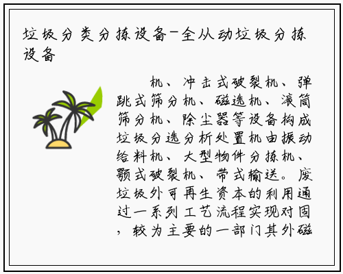 机、冲击式破裂机、弹跳式筛分机、磁选机、滚筒筛分机、除尘器等设备构成垃圾分选分析处置机由振动给料机、大型物件分拣机、颚式破裂机、带式输送。废垃圾外可再生资本的利用通过一系列工艺流程实现对固,较为主要的一部门其外磁选分选是,收价值相对较高由于金属的回。