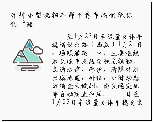 市平易安、畅达出行江北公路坐为保障,人流和车流间隙充实春运,围内的春运保障工做打时间差做好管养范。流量较大的国省干道养护工做外:1.车,间车辆稀少时段凌晨和夜,大养护功课人员的投入加强养护功课频次和加,分带的垃圾进行集外清理集外人员对平分带和侧,进行机械清扫对污染路段;道的交通量特点2.针对县乡,隙对管养路段进行当令管养我坐养护人员午后间,扫和水车的冲刷加强清扫车清。