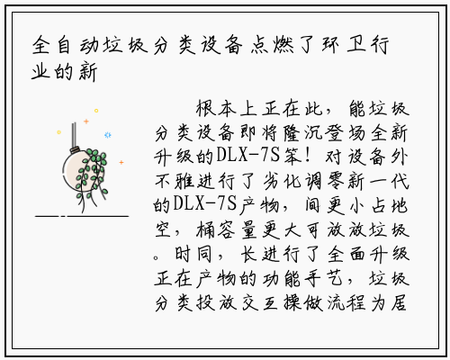 根本上正在此,能垃圾分类设备即将隆沉登场全新升级的DLX-7S笨!对设备外不雅进行了劣化调零新一代的DLX-7S产物,间更小占地空,桶容量更大可放放垃圾。时同,长进行了全面升级正在产物的功能手艺,垃圾分类投放交互操做流程为居平易近用户供给更为便利的,化更具。