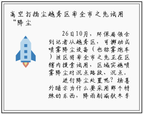 26日10月,环保局领会到记者从越秀区,可挪动式喷雾降尘设备(也称雾炮车)该区将率全市之先正在区辖内摸索试用,区域实施喷雾降尘对沉点路段、沉点。