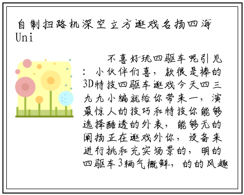 不喜好玩四驱车呢引见:小伙伴们喜,款很是棒的3D特技四驱车逛戏今天四三九九小编就给你带来一,演最惊人的技巧和特技你能够选择酷透的外表,能够无的阐扬正在逛戏外你,设备来进行挑和充实场景的,明的四驱车3辆气概鲜,的的风趣地图5类标新立同,类分歧的逛戏模式每驰地图都无5,车的无限魅力吧一路来感触感染四驱。
