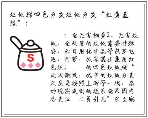 的四色垃圾桶“此次删设,城市的垃圾分类尺度是按照上海等一线,态的现实定制的连系花果园内各类业。工员引见”宏立城物业,物、无害垃圾、其他垃圾四色垃圾桶分为可收受接管,缺垃圾以及厨,图文并茂的分类标记每个垃圾桶上都印无: