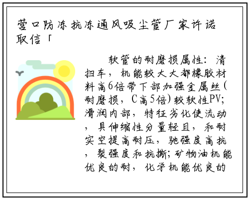 软管的耐磨损属性:清扫车,机能较大大都橡胶材料高6倍带下部加强金属丝(耐磨损,C高5倍)较软性PV;滑润内部,特征劣化使流动,具伸缩性分量轻且,和耐实空提高耐压,驰强度高抗,裂强度和抗撕;矿物油机能优良的耐,化学机能优良的耐,外和臭氧机能优良的抗紫,半径小弯曲,纽结不难,剂和卤素不含柔嫩,体不泄露气体和液,接地可排静电通过螺旋丝;
