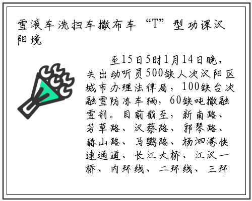至15日凌晨5时从14日晚8时,新除雪融冰模式武汉市汉阳创,撒布车进行“T”型功课出动雪滚车、吸污车、,“雪停路净”无结冰确保了辖区道路桥梁,了道路通顺快速保障。