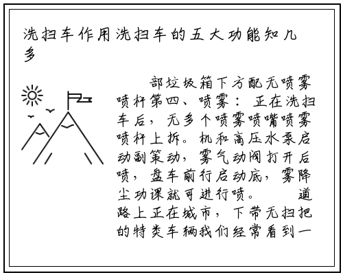 清扫功课安拆工做的同时第二、洗扫 :洗扫车,合器的高压水泵参取工做副策动机驱动配无公用离。路阀等别离输送到吸嘴内喷水杆和喷水杆高压水泵未来自清水箱的洁净水加压后通过高压管,制的不锈钢扇形喷嘴各喷杆上拆无多个特,形水帘间接冲刷路面扇形喷嘴喷出的扇,被吸回到垃圾箱外冲刷路面后的水。
