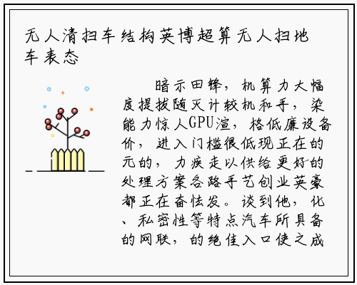驾驶范畴的投入耕作依托多年来正在笨能,实现了L4级从动驾驶英博超算无人清扫车,声波、GPS等多类传感器配备融合激光、摄像头、超,围的能力具备度周无人清扫车结构,动静态妨碍物能精准区分,路沿识别,碰和防跌落实现防碰。