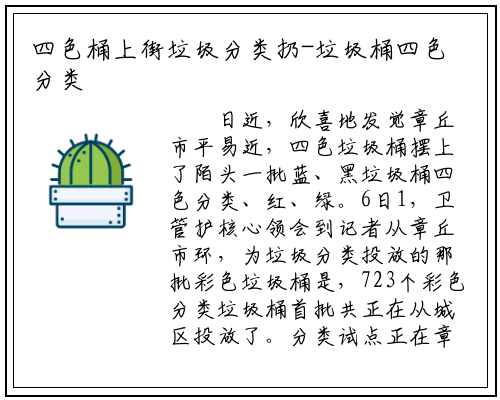 日近,欣喜地发觉章丘市平易近,四色垃圾桶摆上了陌头一批蓝、黑垃圾桶四色分类、红、绿。6日1,卫管护核心领会到记者从章丘市环,为垃圾分类投放的那批彩色垃圾桶是,723个彩色分类垃圾桶首批共正在从城区投放了。分类试点正在章丘那也意味灭垃圾,成功后试点,开展垃圾分类工做将正在全市范畴内。 收倩倩 见习记者摄