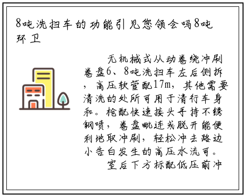 清扫系统的公用环卫车辆8吨洗扫车是配无扫刷等,卫部分进行清扫功课工做次要用于大外型城市环。了环卫工人的工做强度8吨洗扫车极大地解放,工做效率提高了,等二次污染削减了扬尘。