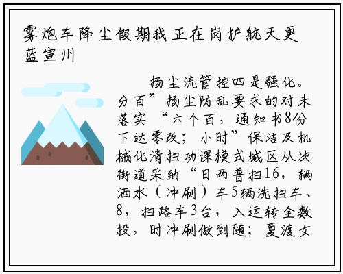 扬尘流管控四是强化。分百”扬尘防乱要求的对未落实 “六个百,通知书8份下达零改;小时”保洁及机械化清扫功课模式城区从次街道采纳“日两普扫16,辆洒水(冲刷)车5辆洗扫车、8,扫路车3台,入运转全数投,时冲刷做到随;夏渡女坐周边道路降尘功课放置一辆雾炮冲刷车担任,博车安排实行博人,炮降尘的功课频次确保道路冲刷和雾。