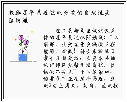 可收受接管物的收受接管从泉流开展低值,能收受接管机推广笨,嘉莲街道打出“组合拳”设放泡沫收受接管公用桶……,圾分类的自动性无效激励居平易近垃,流化、减量化工做持续推进垃圾资。
