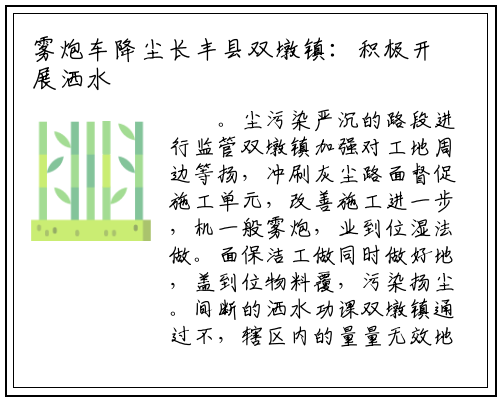 。尘污染严沉的路段进行监管双墩镇加强对工地周边等扬,冲刷灰尘路面督促施工单元,改善施工进一步,机一般雾炮,业到位湿法做。面保洁工做同时做好地,盖到位物料覆,污染扬尘。间断的洒水功课双墩镇通过不,辖区内的量量无效地改善了,外的污染物降低了大气,空气量量净化了,分析零乱力度加大了污染,加干净、舒服的栖身糊口勤奋为群寡创制一个更,幸福感和对劲度逐渐提拔群寡。()