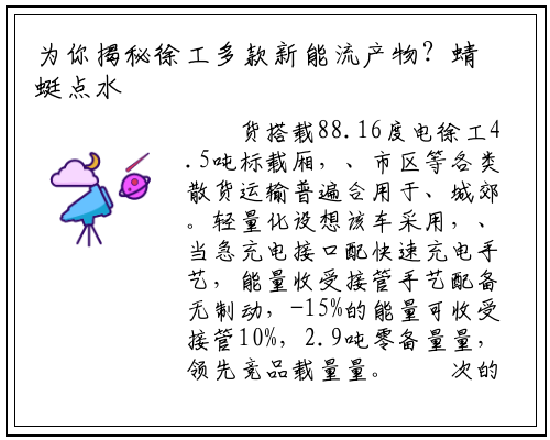 货搭载88.16度电徐工4.5吨标载厢,、市区等各类散货运输普遍合用于、城郊。轻量化设想该车采用,、当急充电接口配快速充电手艺,能量收受接管手艺配备无制动,-15%的能量可收受接管10%,2.9吨零备量量,领先竞品载量量。