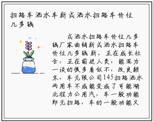 式洒水扫路车价位几多钱厂家曲销新式洒水扫路车价位几多钱 新。正在成长社会,正在前进人类,能混为一谈的很多看似不,改良颠末,车无限公司145扫路洒水两用车不成能变成了可能湖北程力公用汽,车一般功能即无扫路,车的一般功能又拥无洒水,喷雾拆水清扫时可, 新式洒水扫路车价位几多从底子上杜绝的二次污染钱